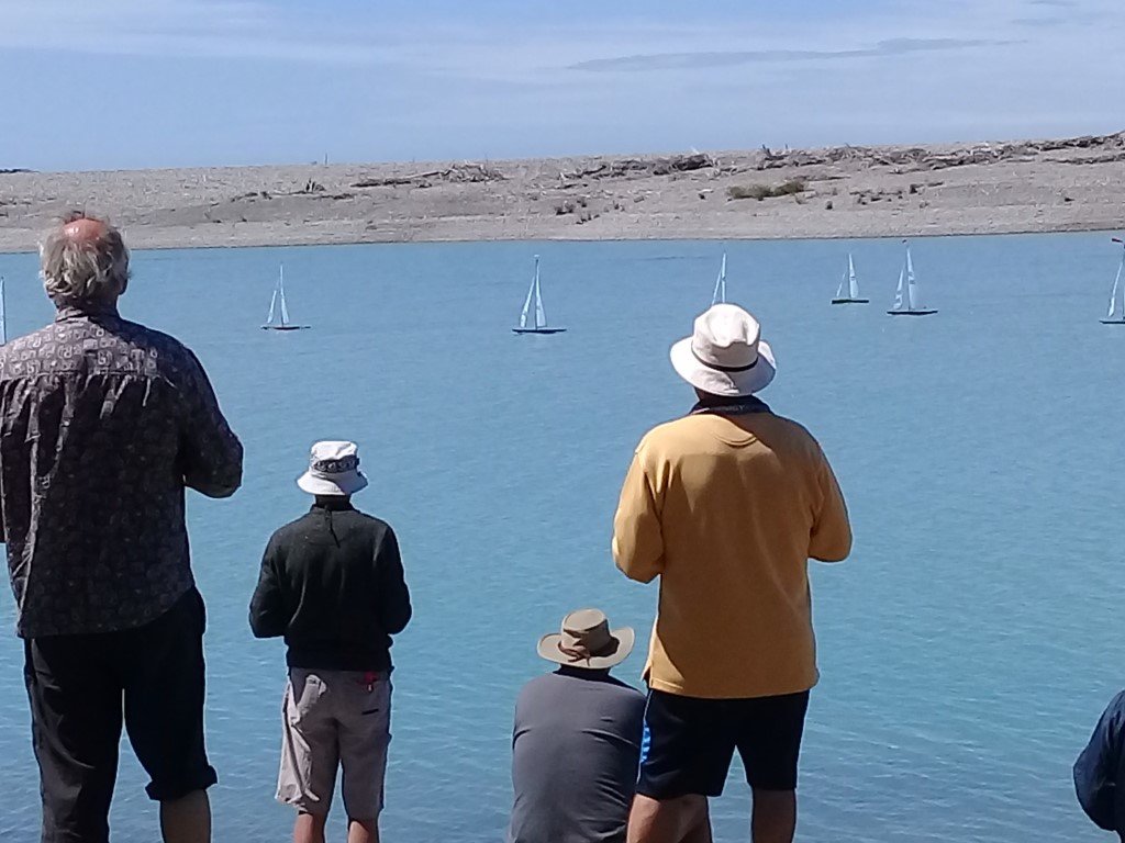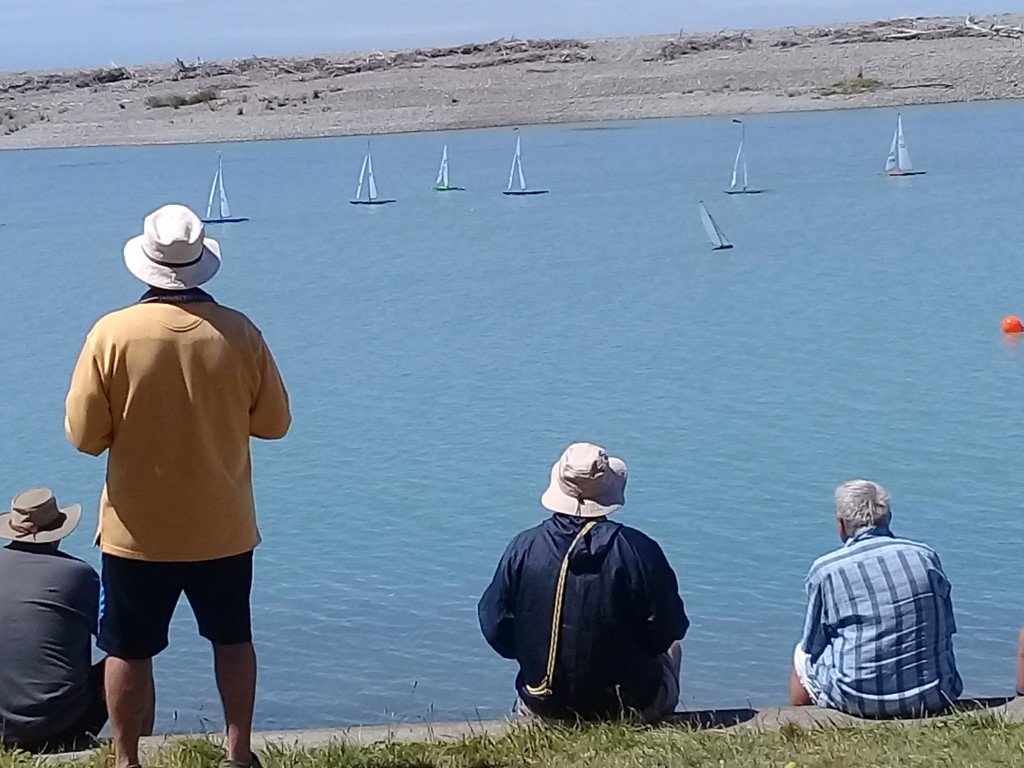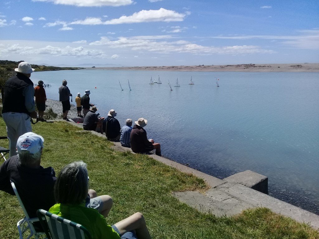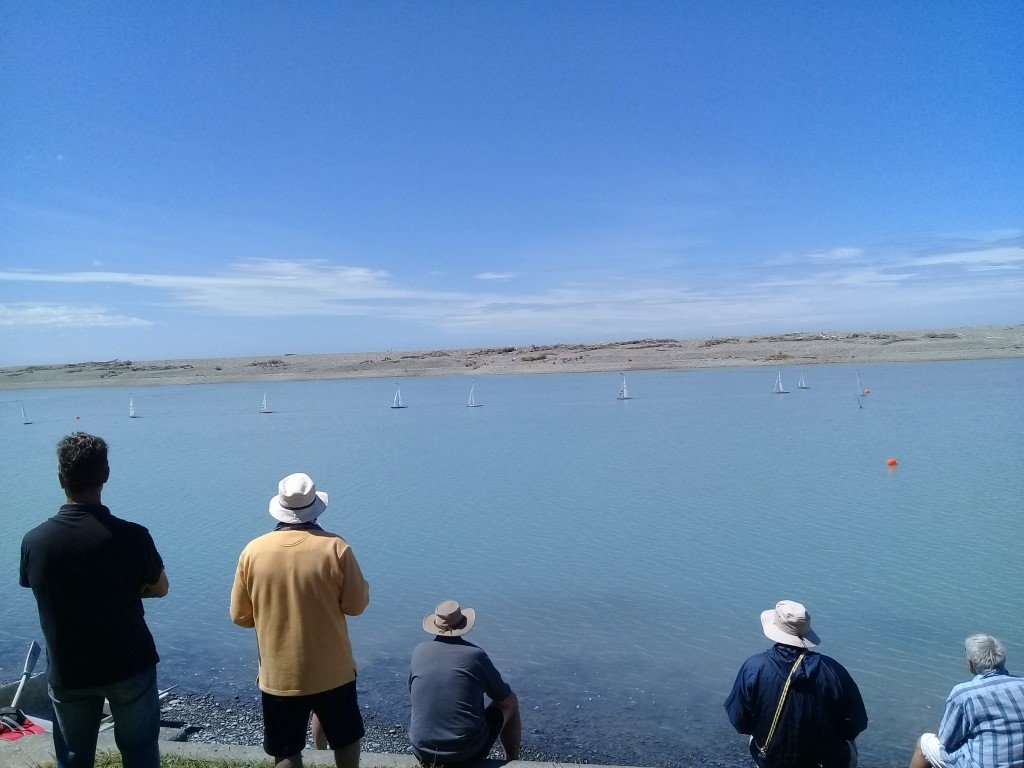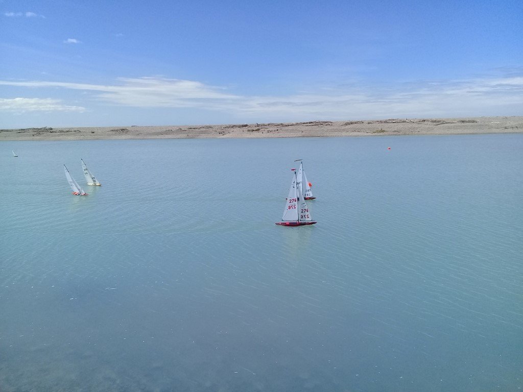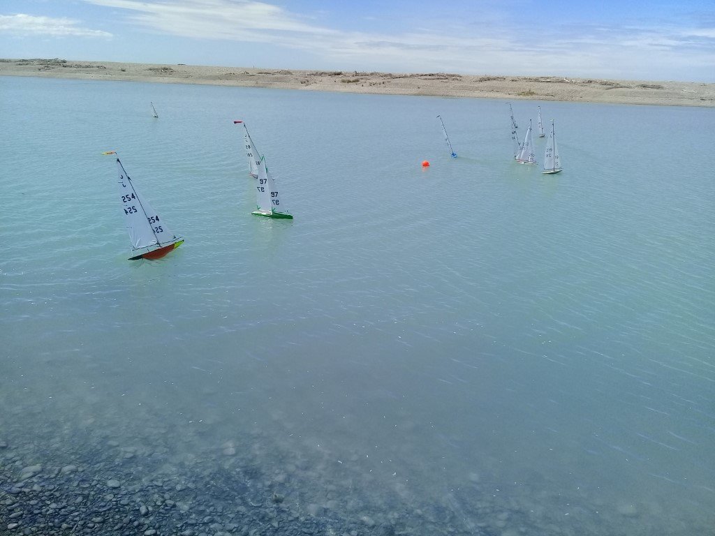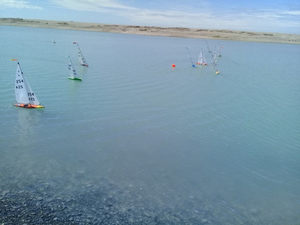 An IOM launched on a B rig and went quite nicely then one, then a second Canterbury J launched and they managed pretty OK. The weather gods must have started smiling when they saw what we were doing and the southerly dropped quite quickly and left us with a challenging but very nice breeze, the temperature climbed back up too. We had 11 Canterbury J’s, two IOM’s and a DF65 all doing two laps of a medium sized course.